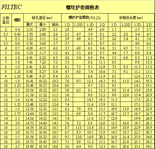 法國(guó)FILTEC螺紋護(hù)套是一種新型內(nèi)螺紋緊固件,可嵌入金屬或非金屬材料上,形成高強(qiáng)度、耐磨損,具有互換性的標(biāo)準(zhǔn)內(nèi)螺紋,也可用于修復(fù)磨損或損壞的內(nèi)螺紋孔。螺紋護(hù)套是菱形絲******成形的螺旋線圈,為內(nèi)外螺紋同心體,其一端帶有沿徑向彎曲的安裝柄。自由狀態(tài)下是螺紋護(hù)套直徑比其裝入的內(nèi)螺紋稍大,裝配過程中安裝工具加到安裝柄的扭力使其引導(dǎo)圈直徑進(jìn)行彈性收縮,從而進(jìn)入預(yù)先用螺紋護(hù)套專用絲攻攻好的內(nèi)螺紋孔內(nèi),裝好以后,螺紋護(hù)套產(chǎn)生類似于彈簧作用的膨脹,使其牢固的固定在內(nèi)螺孔中,這樣螺紋護(hù)套便形成了一個(gè)符合國(guó)際標(biāo)準(zhǔn)的高精度內(nèi)螺紋。螺栓和螺孔之間導(dǎo)致不均勻應(yīng)力分布在螺距和角度誤差,可通過螺紋護(hù)套的彈性來平衡,其全部螺旋線都能分擔(dān)載荷。螺紋護(hù)套按其功能分為普通型和鎖緊型兩種,鎖緊型螺紋護(hù)套除具有普通型號(hào)的全部功能外,還具有螺紋鎖緊能力,這是依靠其多邊形鎖緊的彈力對(duì)螺栓螺紋產(chǎn)生摩擦力,達(dá)到自鎖的目的。